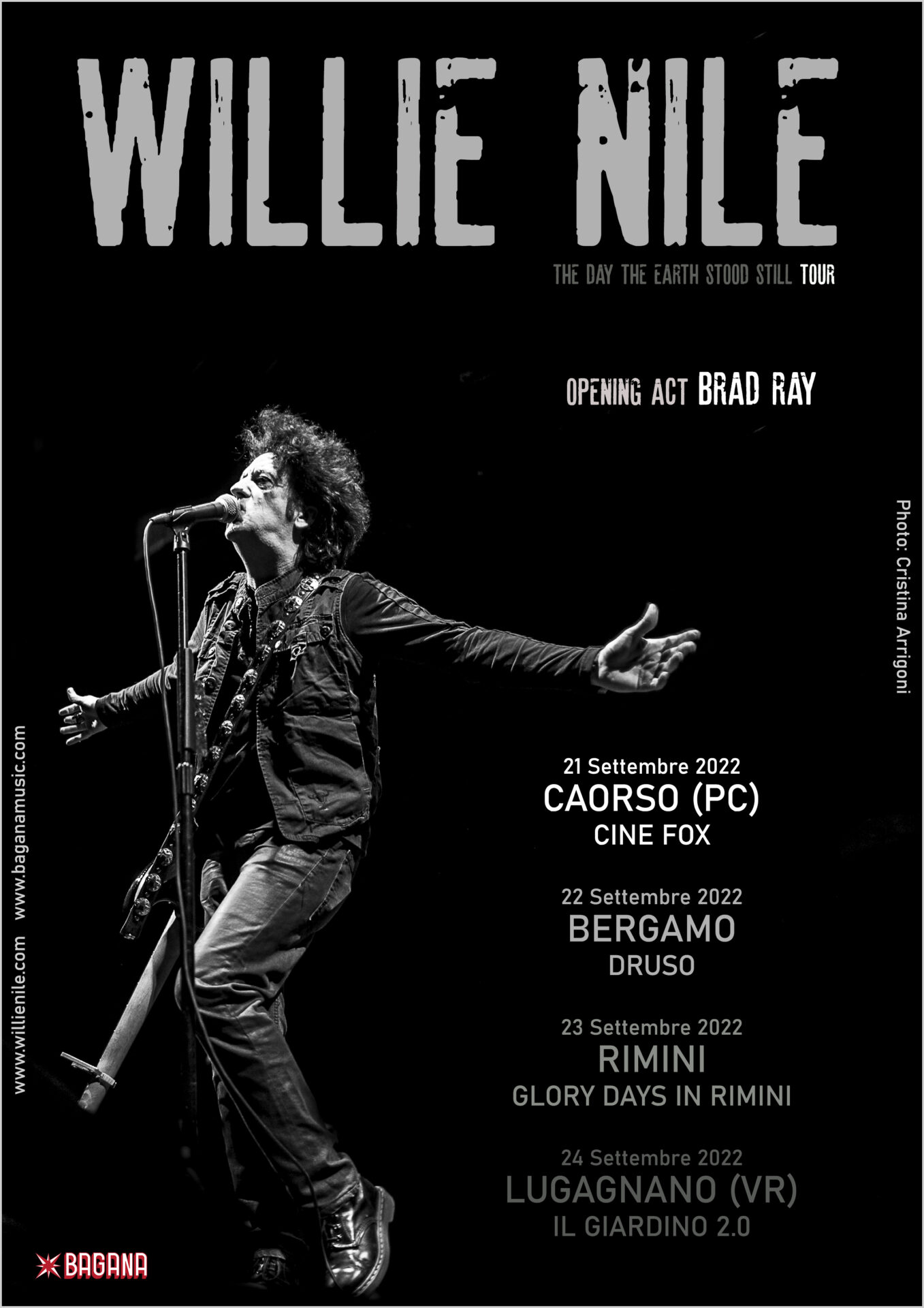Posticipati a settembre 2022 i concerti della leggenda del rock underground newyorkese WILLIE NILE, che sarà  in Italia per quattro appuntamenti esclusivi a supporto dell’ultimo lavoro in studio “The Day the Earth Stood Still”, uscito lo scorso agosto. I concerti saranno al Cine Fox di Caorso (PC) mercoledì 21 settembregiovedì 22 al Druso di Ranica (BG)venerdì 23 settembre al Glory Days Festival di Rimini, per concludere sabato 24 Lugagnano (VR) presso Il Giardino 2.0. Le date vedranno in apertura il cantautore americano Brad Ray.